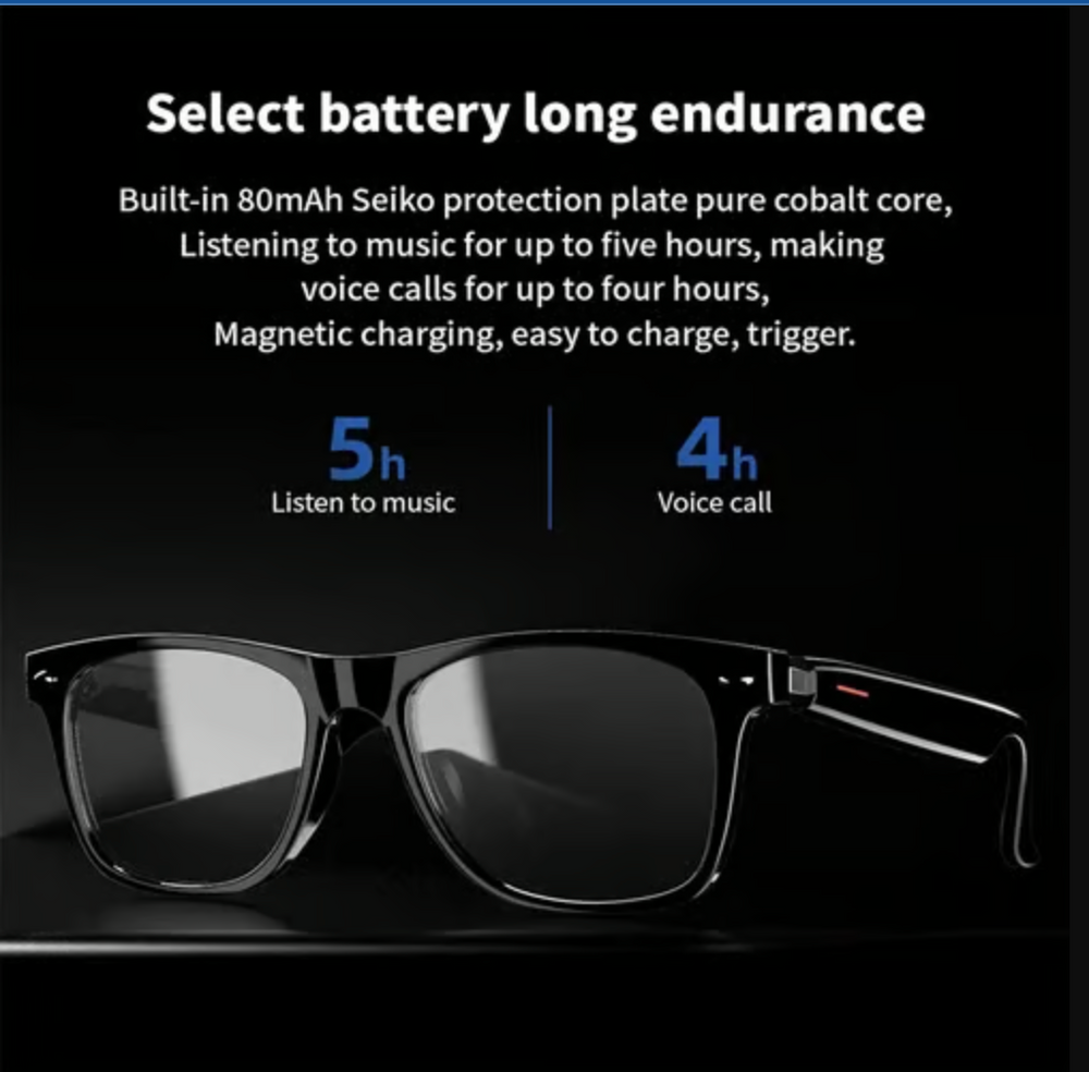 The bluetoth glasses built-in rechargeable 100+100mAH battery that can sustain a clear call for about 4 Hours, or play about 4 hours of music, standby time is about 150 hours, charging time is only 1-2 hours.